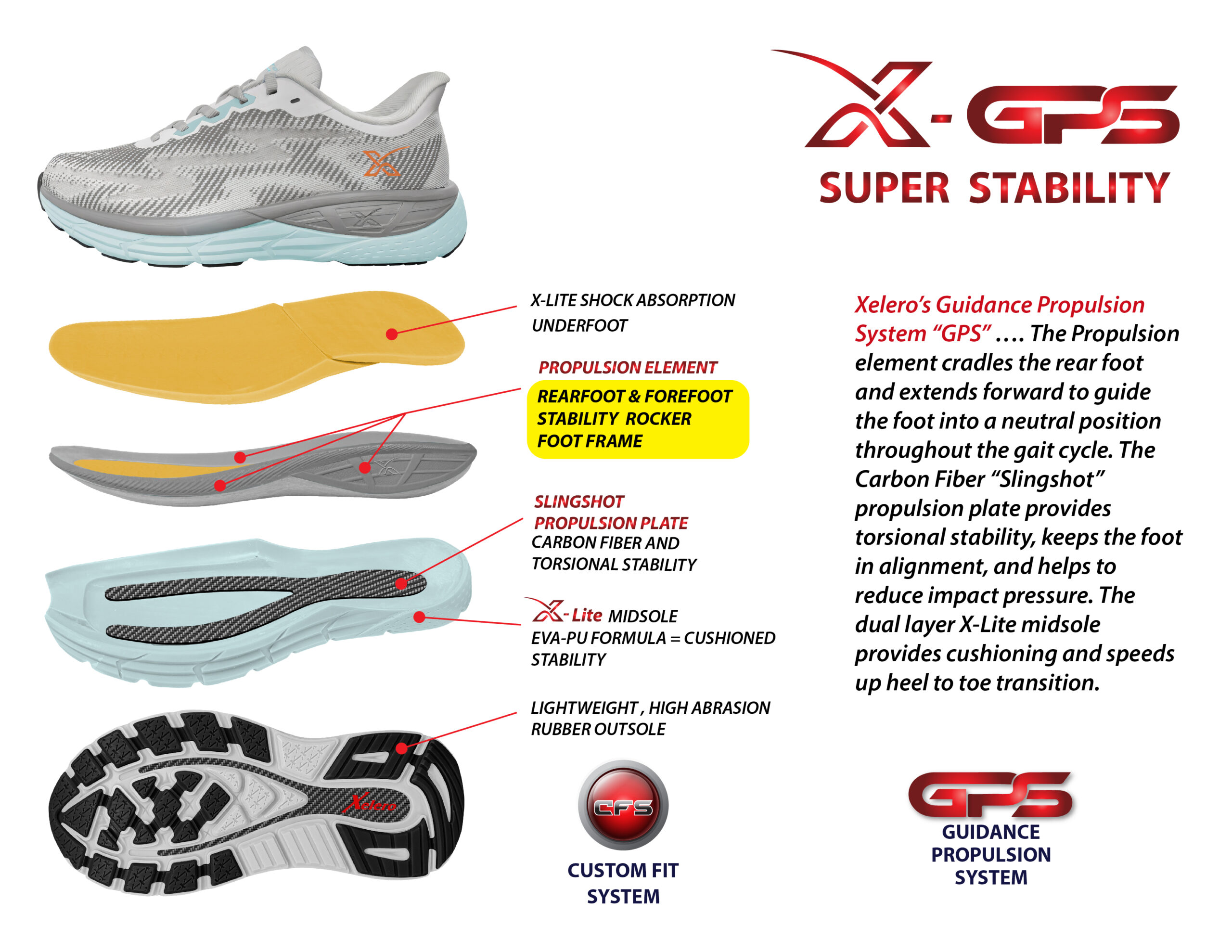 The Xelero X-GPS provides unparalleled support and functionality. The enhanced Xelero technology incorporates a “Guidance Propulsion System”. The Propulsion element cradles the rear foot and extends forward to guide the foot into a neutral position thought the gait cycle. The carbon fiber “Slingshot” plate provides torsional stability, keeping the foot in alignment, and helps to reduce impact pressure. The dual layer “X-Lite” midsole provides cushioning, under the foot, and speeds up heel to toe transition when walking or running. The X-GPS is lighter weight than some of our other Xelero shoes and the only motion control/stability shoe in the market with rearfoot and forefoot stability.  Ideally suited for running and walking.